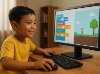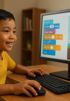 Anak belajar membuat game sederhana dengan Scratch sambil berimajinasi.